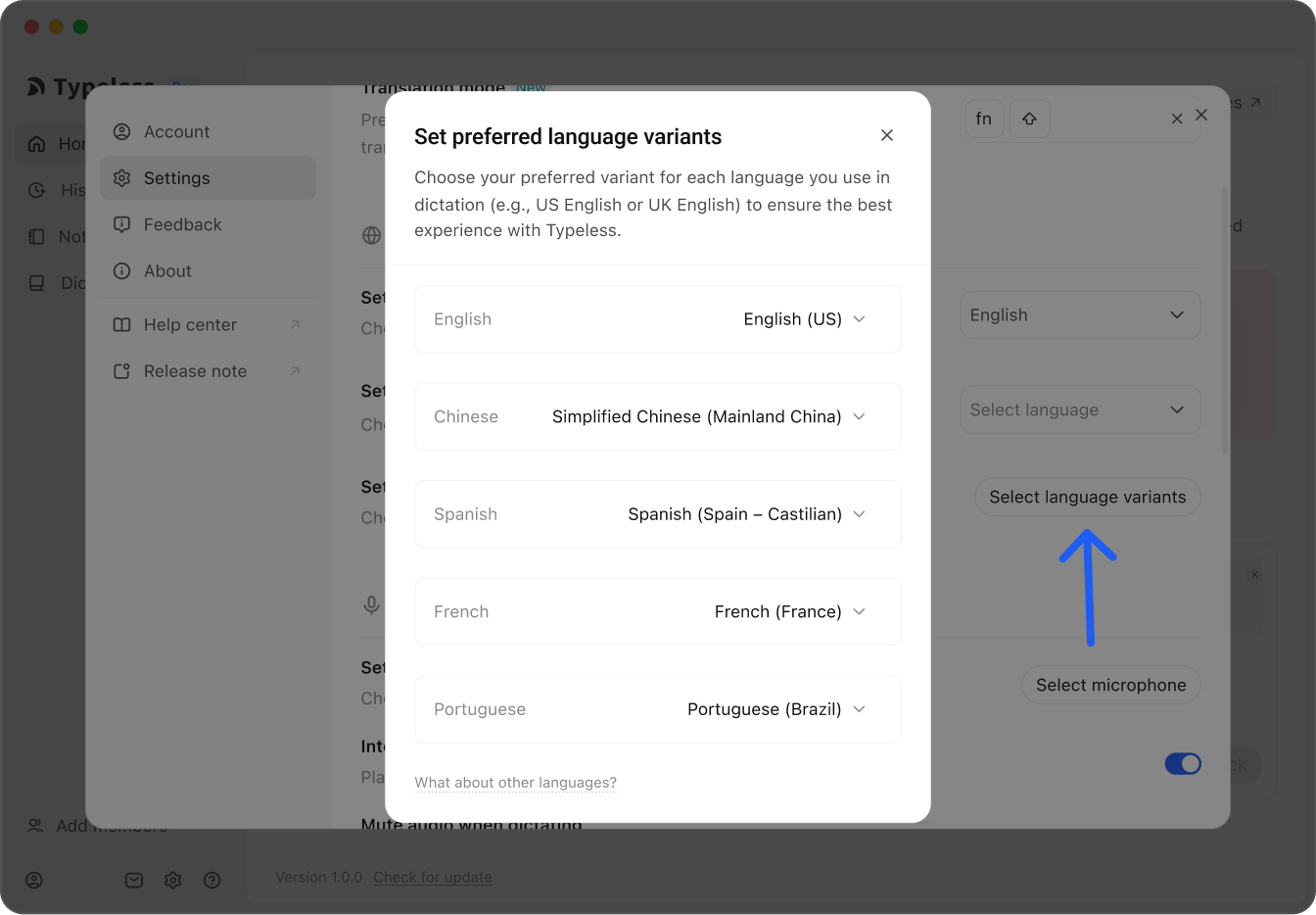 선택하면 Typeless는 해당 특정 방언에 대한 인식을 자동으로 최적화합니다.